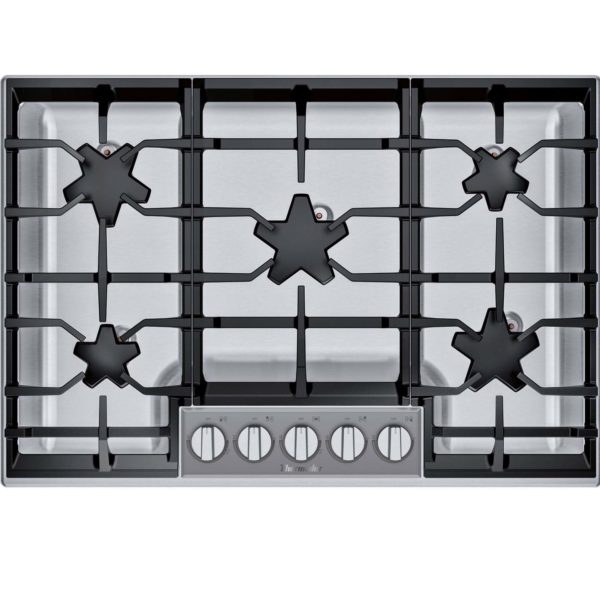 A Thermador oferece um impressionante cooktop a gás de 30” (787mm) com 5 queimadores elevados, incluindo um queimador central mais poderoso, 2 queimadores com ExtraLow®, e um total de 54.000BTU de potência.