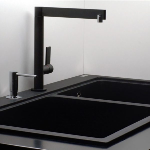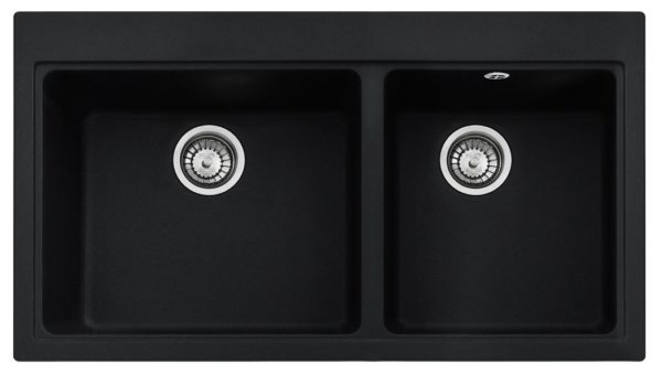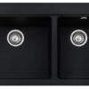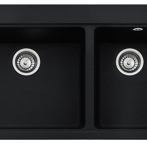 A Cuba Dupla Franke de Embutir (51 x 91 cm) possui profundidade de 23 cm e possui acabamento Fragranite Onyx Black de altíssima resistência.