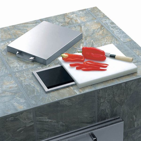 Esta linda estação de preparo possui uma tábua de corte que esconde uma canaleta para dispensar os resíduos diretamente na lixeira. Prepare drinks, corte frutas, legumes, carnes, e dispense na canaleta escondida.