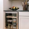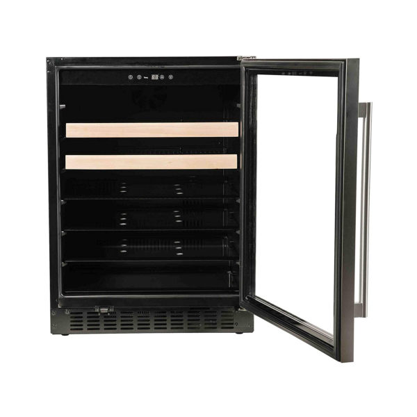 A Azure apresenta este Frigobar que pode ser freestanding ou embutido. Pode acomodar até 10 garrafas de vinho e 80 latas de 350 ml. Utiliza iluminação LED azul para iluminar o interior, contribuindo para o ambiente. A porta é reversível. Controles de display digital são fáceis de ler e de definir a temperatura.